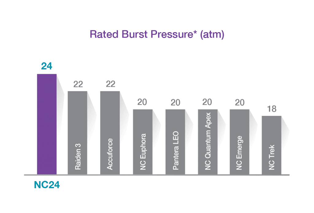 The Sapphire NC24 is designed for high-pressure dilatation while maintaining precise control of the balloon diameter and length, making it ideal for preparing tight, calcified lesions and stent optimization.