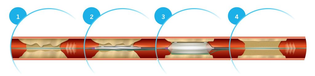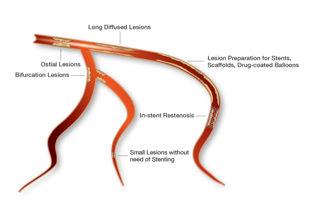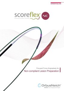 Scoreflex NC is a focused force dilatation balloon with a dual-wire system which creates a focal stress pattern to facilitate safe and controlled plaque modification at lower resolution pressure.